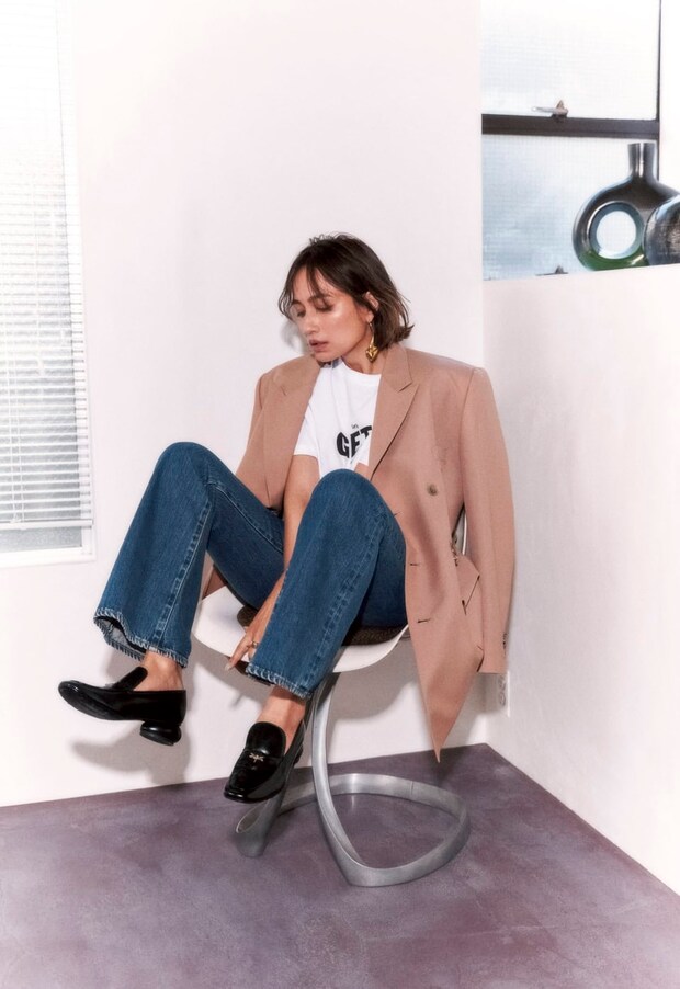 トンボローファー[真由美着用]¥53,900、(アキラナカ/ハルミ ショールーム)、ジャケット¥148,500(ミスターイット)、Tシャツ¥7,700(アメリカン ドリームズ)、デニムパンツ¥25,300(RHC/全てRHC ロンハーマン)、ピアス¥69,300(CALLMOON/ショールーム セッション)、ゴールドリング¥29,700、シルバーリング¥24,200(共にバー ジュエリー/エルディスト)