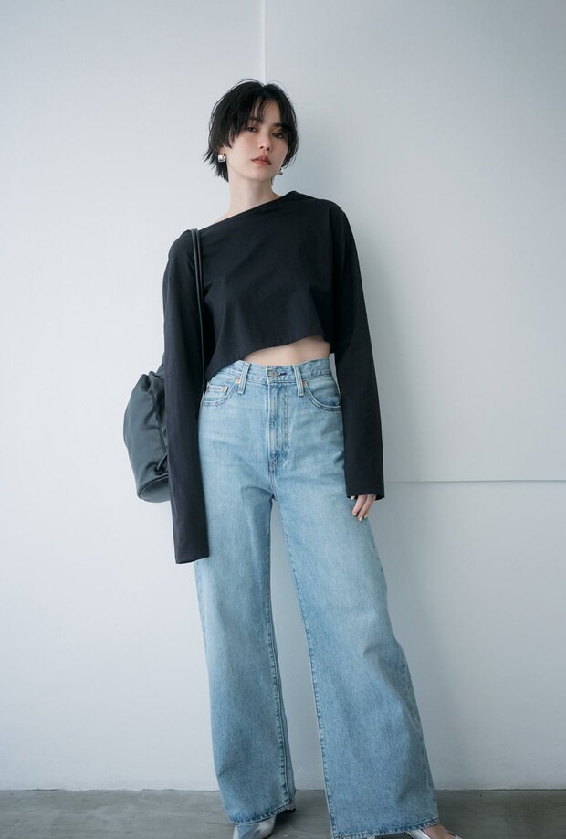短めのトップスに、ルーズかつワイドなデニムというバランスがトレンド最前線。お腹を出せないという人はハイウエストボトムを選べばOK。ショートTシャツ¥15,400(オーラリー)、デニムパンツ¥14,300(リーバイス®/リーバイ・ストラウス ジャパン)、ピアス¥41,800、リング¥58,300(共にコールムーン/ショールーム セッション)、バッグ¥14,300(トゥデイフル/Life's 代官山店)、サンダル¥6,590(ザラ/ザラ カスタマーサービス)