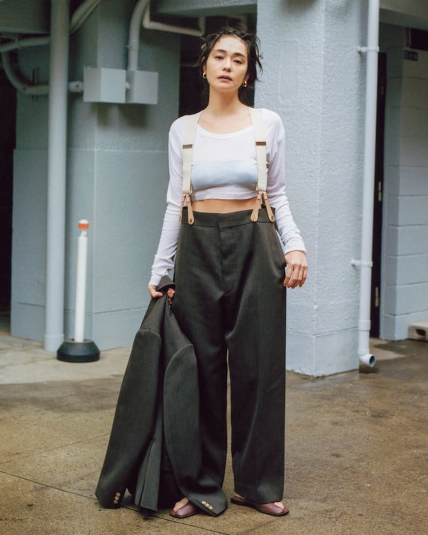 パンツ[SIZE:3]¥52,800、手に持ったジャケット[SIZE:3]¥107,800、サスペンダー¥12,100※全てメンズ(全てヒューベント/エレメントルール カスタマーサービス)、Tシャツ¥13,200(アストラット/アストラット 新宿店)、ピアス¥55,660(トムウッド/トムウッド 青山店)、サンダル¥41,800(フミエタナカ/ドール)、その他スタイリスト私物