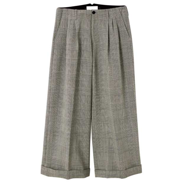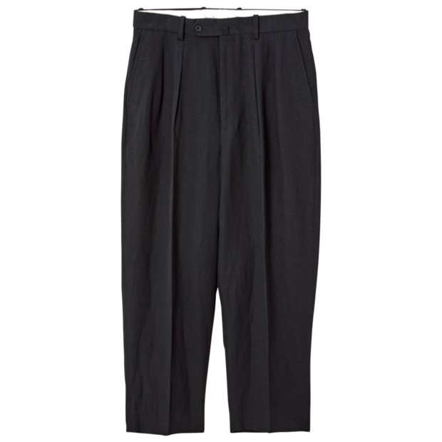 ウィメンズに比べ、もともとの型数が少ないぶん、素材やシルエットに目一杯こだわるのがメンズやユニセックスの特徴。それを大いに堪能するなら定番アイテムのスラックスをまずは1本。せっかくのシルエットを損ねないよう、ここではあえてサスペンダーを活用して腰まわりのもたつき回避がマスト。