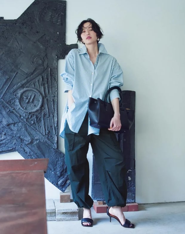 第4位はベーシックアイテムを使った着まわし特集で比留川游さんがサラリと着こなしていたシャツスタイル。第5位同様、ワークテイストのパンツにヒールや無造作な肌見せトップスという、バランスにコメント多数。「さりげないのに色気があり一目惚れ」「シンプルに見えて洗練されてて素敵」「バッグとサンダルの使い方がいい」など。ミューズらしいテイストMIXはやっぱり人気でした。