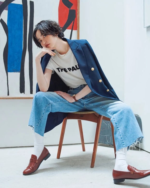 ジャケット¥40,700(デミルクス ビームス/デミルクス ビームス 新宿)、Tシャツ¥7,150(ザ ポーズ/ウィム ガゼット ルミネ新宿店)、デニム¥20,900(ローラス/ジャック・オブ・オール・トレーズ プレスルーム)、ネックレス¥7,700(チビ・ジュエルズ/チビジュエルズ・ジャパン)、ピアス¥3,300(アプロ/ロードス)、腕時計¥25,300(ロゼモン/ピークス)、ソックス¥1,430(ホイサム)、ローファー¥17,930(ア ドゥ ヴィーヴル)