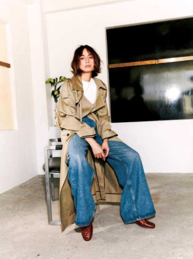 トレンチコート¥154,000(カルメイヤー)、デニムパンツ¥40,700(シチズン オブ ヒューマニティ/共にアパルトモン 神戸店)、Tシャツ¥12,100(アンスクリア/アマン)、ベルト¥12,100(レフィエ/フラッパーズ)、シューズ¥80,300(ヘリュー/ショールーム セッション)、イヤリング¥16,500(IRIS47/フーブス)