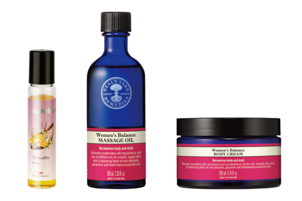 右から:華やかな花々の香りが全身をふわり。リッチな使用感。ウーマンズバランス ボディクリーム 200mL ¥7,590、肌がつやり。同 マッサージオイル 100mL ¥3,850 (共にニールズヤード レメディーズ)、女性と密接なハーブが7種類も。センシュアル ロールオン 10mL ¥2,640(ナリン/コスメキッチン)
