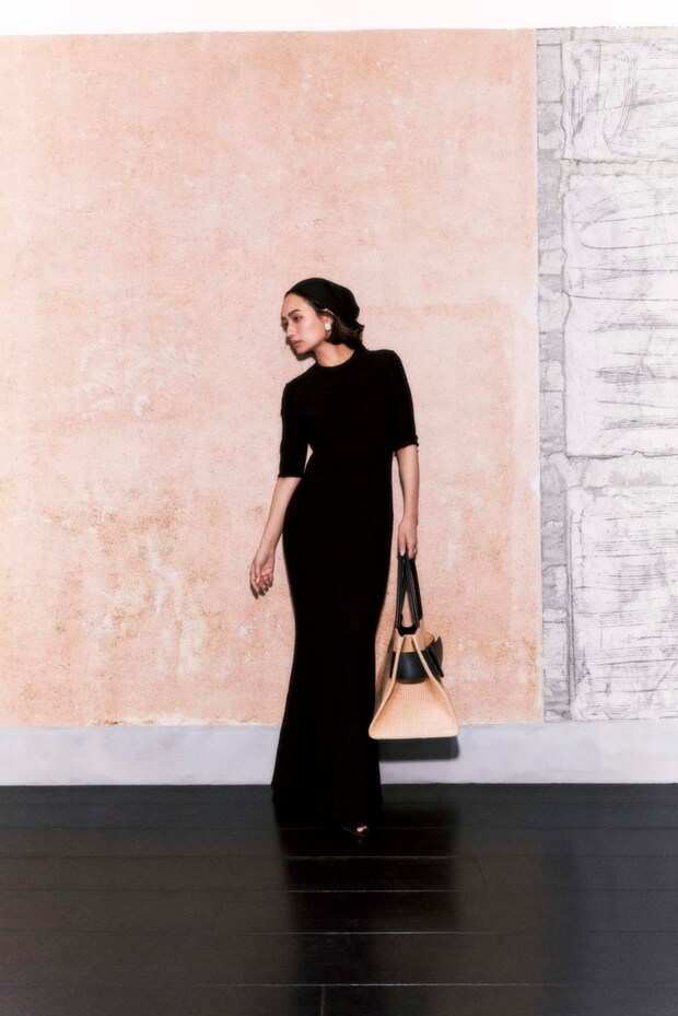 ドレス¥42,900(マメ クロゴウチ/マメ クロゴウチ オンラインストア)、バッグ¥504,250(ボーイ/エム)、イヤリング¥13,200(ケネス ジェイ レーン/シティショップ)、頭に巻いたストール¥25,300(アソースメレ/トゥモローランド)、シューズ¥61,600(ペリーコ/アマン)