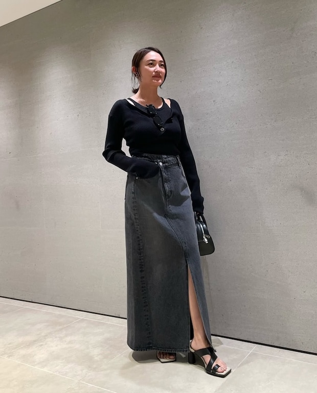「カップインのアメスリトップスは気楽に着られるうえ、女性らしいシルエットが作れるオススメアイテム。ハートモチーフのリングとネックレスも“大人可愛い”をアクセントとして入れられるので気に入っています。デニムスカートはシルエットとウエストのアシメデザインが◎」アメスリニット¥13,970、デニムスカート¥23,100、ネックレス¥4,950、リング¥10,670(全てFRAY I.D/フレイ アイディー ルミネ新宿 2店)
