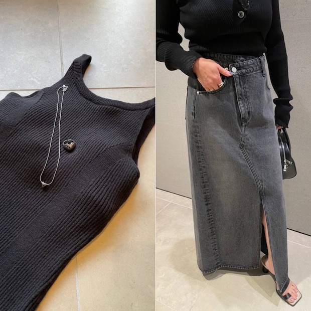 「一見シンプルに見えるニットとデニムの組み合わせですが、カーディガンがウルトラクロップト丈になっていたり、タンクは旬のアメスリデザインと女性らしいカッティング、カップインになっているのがポイント。楽だけどトレンドを意識した、リラックスモノトーンカジュアルに仕上げました」