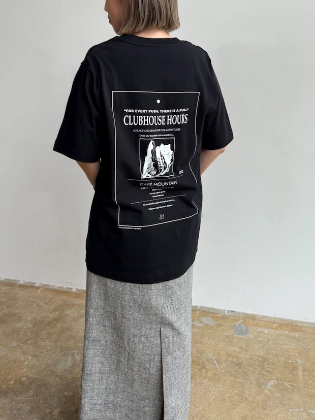 「日本初上陸ブランドの〈カフェ マウンテン〉のTシャツを主役にしたコーディネート。ユニセックスで着られるサイズ感が好みなのと、バックのグラフィックが印象的で、ストリートっぽくも着られます。前後スリットが大胆なグレンチェックのスカートを合わせることで、ストリート過ぎずにモードな雰囲気になるよう意識しました」