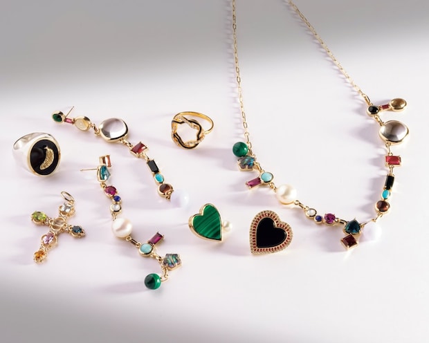 左から:リング¥198,000、クロスチャーム¥143,000、ピアス¥495,000、リング¥352,000、グリーンのハート形イヤリング¥99,000、ブラックのハート形イヤリング¥297,000、ネックレス¥550,000(全てエナソルーナ)