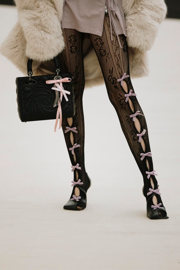 ロマンティックなムードを加速させる、タイツにリンクさせたリボンのチャーム。