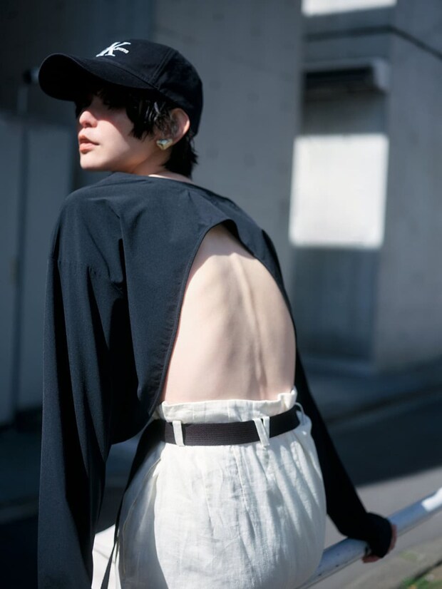 ウォッシャブル&UVカット仕様のトップスは、タンクトップなどに重ねたり、前後逆で着てもOK。ショートTシャツ¥16,500(styling//スタイリング/ 新宿ルミネ1店)、ベルト付きパンツ¥40,700(エンフォルド)、キャップ¥7,700(カルバン・クライン ジーンズ/カルバン・クライン カスタマーサービス)、イヤリング¥12,100(IRIS47/フーブス)、シューズ¥6,590(ザラ/ザラ カスタマーサービス)