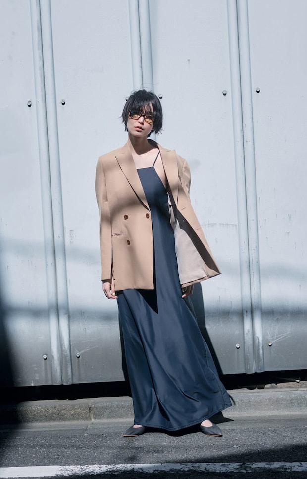 スイムウェアと同素材なため、速乾性があり、海やプールなどリゾートシーンでも大いに活躍してくれるキャミドレス。しかも、ブラカップ付きなところも◎。キャミドレス¥26,400(ナゴンスタンス)、ジャケット¥107,800(ハイク/ボウルズ)、メガネ¥57,200(ミュウミュウ/ルックスオティカジャパン カスタマーサービス)、シューズ¥94,600(マルティニアーノ/エイチ ビューティ&ユース)