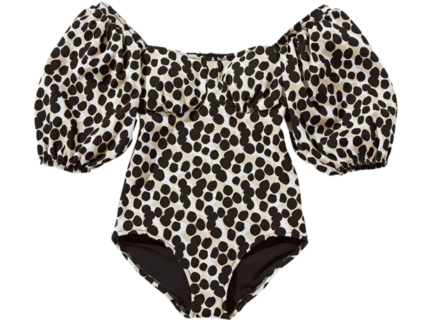 バルーンスリーブが可愛いスイムウェアは、トップスとしてデニムやショートパンツに合わせて着たい! マーブルスイムウェア¥44,000(コルコバード/フィルム)