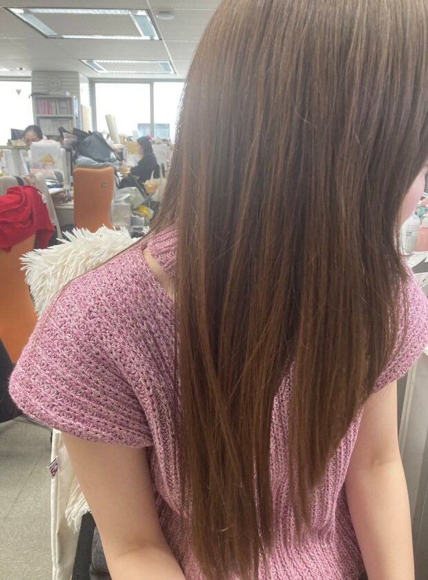 汚い背景は見ないで、美髪だけに注目してください。Mちゃんこの日はブローなし、シャントリした後、乾かしただけでこの髪に♡ 素晴らしい!