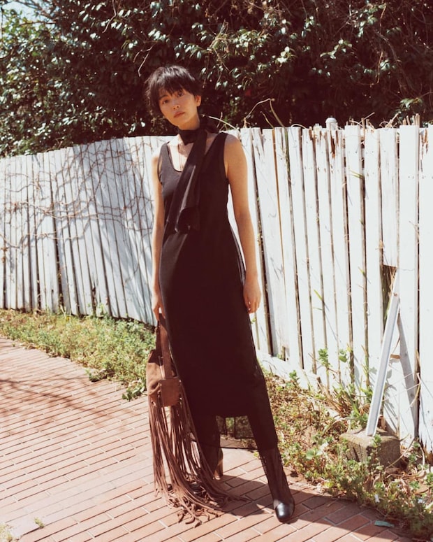 ブラックドレスとフリンジバッグを軸にしたBOHOルックは、フォークロア色を強めてしまうと途端に古く見えがち。透け感のあるドレスを重ねたり、首まわりの装飾感でドレッシーなテンションを加速させたりと、ノーブルに仕上げるのが正解。