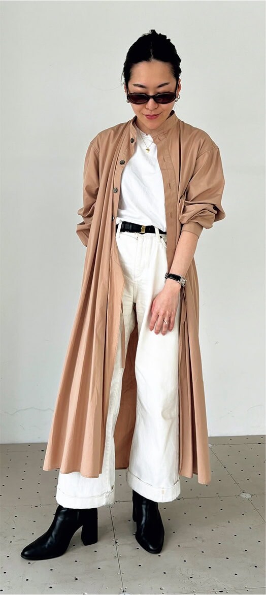 「横長フォルムが旬のサングラスは、ロングシャツとトーンを合わせて統一感を。シンプルなコーデもサングラス1本でグッと引き締まります」