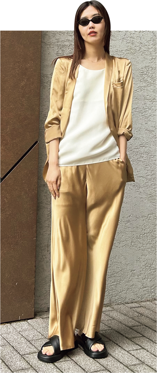 サングラス¥57,200(ミュウミュウ/EYETHINK 渋谷パルコ店)、ジャケット¥71,500、タンクトップ¥30,800、パンツ¥63,800(全てイエナ)、サンダル¥19,800(ヴィニーロ/全てメゾン イエナ)