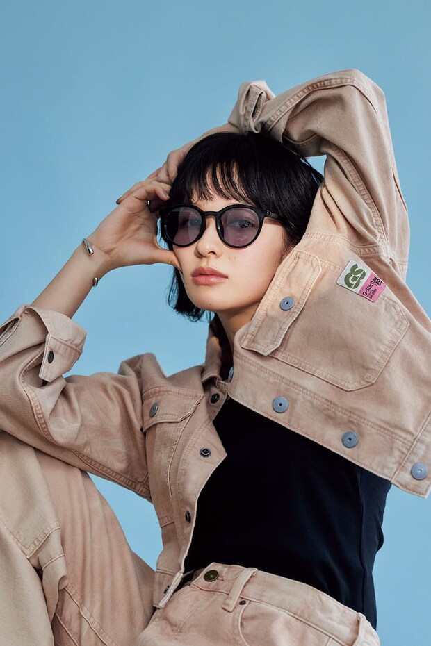 「今季日本初上陸のジミー・フェアリーのサングラスは、エッジのきいたキャットアイ型なので、モノトーンでシックに仕上げました」