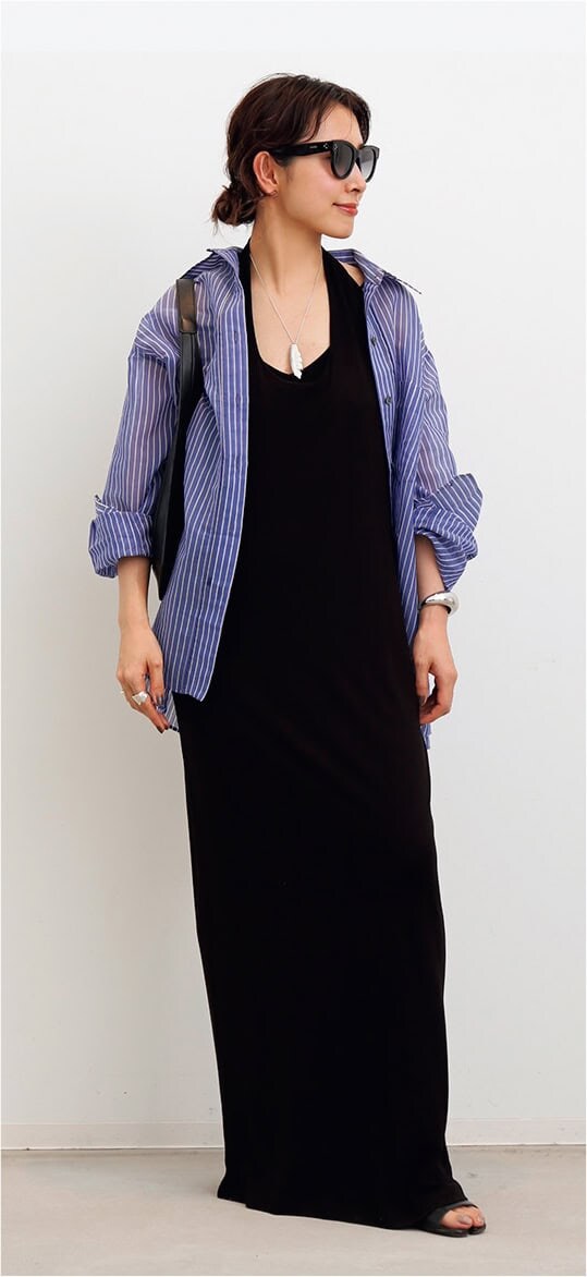 「ブラックでシャープなデザインのサングラスなので、スタイリングはヌケ感のあるシアーシャツをカットソー素材のドレスに羽織って軽やかに」