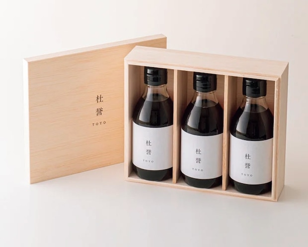 兵庫県神戸市にある歴史ある醤油蔵、池本醤油との共作のだし醤油。淡口醤油と鰹出汁を合わせたキリッと澄んだ味が特徴。杜誉木箱三本入りギフトセット¥3,888(杜誉醤油) 問https://www.toyoshoyu.com
