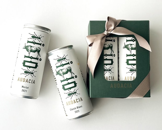 南アフリカの植物ハニーブッシュ・ルイボス由来のタンニンの抗酸化作用を取り入れた、酸化防止剤無添加&化学物質不使用のナチュラルワイン。環境にもからだにも優しく、「翌日残らないのがいい」と佐藤さん。ナチュール缶ワイン2本セット¥2,530(futo) 問https://futo.jp/