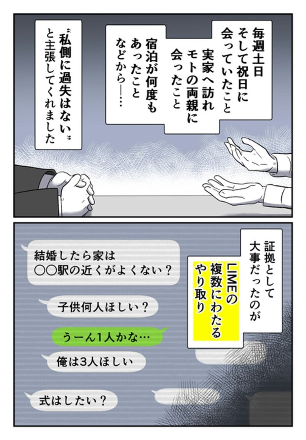 これまでのやり取りでは、モトさんが「既婚者」であることを匂わせる内容は皆無でした。そして、週末を一緒に過ごしていたことや、モトさんの両親にあいさつしていたことなどからも、尾持さんに「過失はない」と、弁護士の正木さんは相手方にしっかりと主張します。