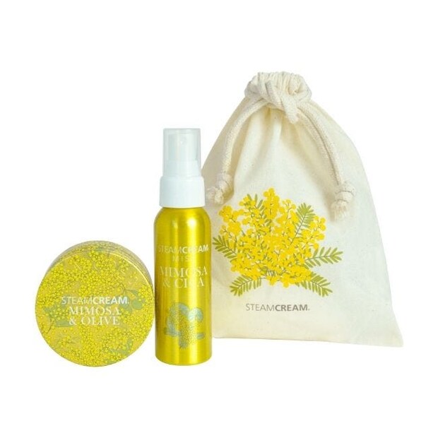 セット内容:スチームクリーム ミモザ&オリーブ、スチームクリーム ミスト ミモザ&CICA、ミモザプリント巾着