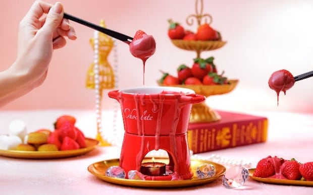パティシエ特製のソースをたっぷりと。遊び心を添えるいちごチョコレートフォンデュ