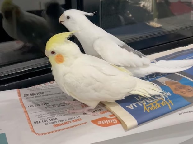 飼い主さんが、白いオカメインコさんに向かって