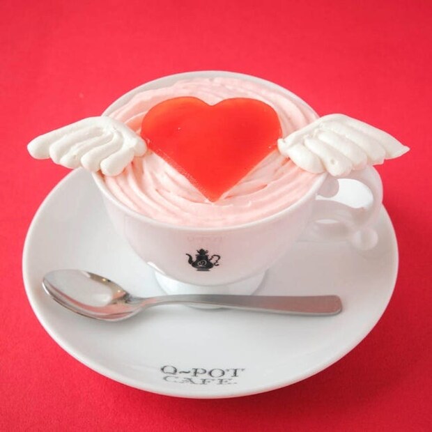 ストロベリーや花の華やかな香りが魅力のQ-pot CAFE.オリジナル紅茶“フラワーガーデン”に、ふんわりやわらかな桃の味わいをプラスしたエンジェルティーラテ。カップいっぱいのハートゼリーを、ストロベリークリームと一緒に溶かして召し上がれ。