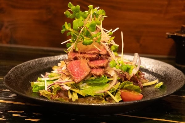 和牛たたきは、やわらかくてとろけるような口どけ。単品でしっかり味わうもよし、たたきがたっぷりのったサラダとして楽しむもよし。