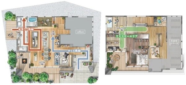 また、家事ラク動線として、キッチンから洗面室・ランドリールーム・ウッドデッキまでをスムーズにつなぐことで、洗濯や家事全般の効率を高めた。さらに、子どもの自立を促す「キッズ動線」は、片付け・整理整頓・手洗い・学習が自然に身につくよう配慮した配置計画にしている。これによって、子どもが無理なく自立できる環境づくりをサポートする。