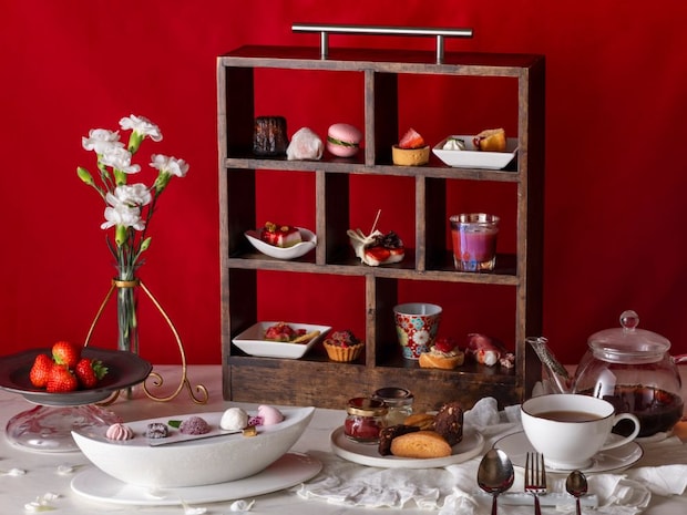 ティースタンドのスイーツには、「ピスタチオと苺のムース」や「苺大福」、「ラズベリーとホワイトチョコレートのモワルー」、「苺スープ」など果実の甘酸っぱさと香りを生かした一品を。