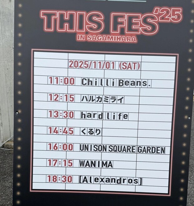 [Alexandros]メンバーの川上さんとギターの白井眞輝さん、お二人の出身地が神奈川県・相模原市なのですが、市制施行70周年を記念した取り組みの一環として、[Alexandros]主催の屋外ライブイベント「THIS FES」が2024年にスタート。初回開催から話題を集めていましたが、その時は残念ながら行けず。そもそもライブやフェスが好きで、フジロックにも10年通い続けた時代もありましたが…遠い昔の話(というより若かった)。さらに暑がりゆえ、真夏開催のフェス自体にすっかり足が遠のいていました。しかし「THIS FES」は晩秋の開催!!季節的にもちょうどよく、ついに「THIS FES’25」では、ぼっち参戦ながら楽しんできました♪