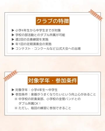 小学4年生から中学生までを対象に、学校の吹奏楽部・金管バンド等とのダブル所属も想定し、週2回の合奏練習を基本に活動。年1回の演奏会や地域イベントへの出演、人数に応じたコンテスト・コンクールへの挑戦も視野に入れている。