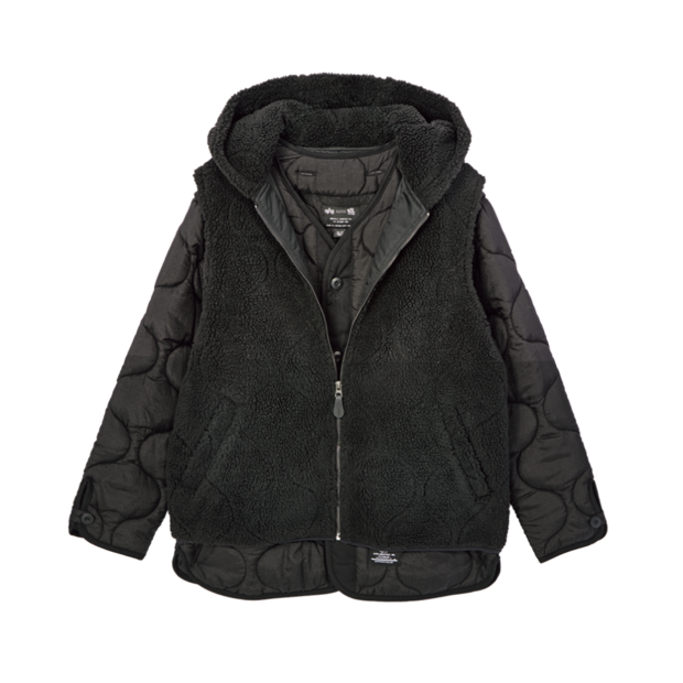 「アルファ インダストリーズは、1959年にアメリカ・テネシー州で設立されたアパレルメーカー。現在は本格的なミリタリーウェアやタウンユース向けのアイテムを展開しています。こちらはキルティングジャケットに、ボアフーディベストをレイヤードしたアイテムで、単体でも着用可能。オニオンキルトのデザインが特徴で、高い断熱性能を発揮してくれます」