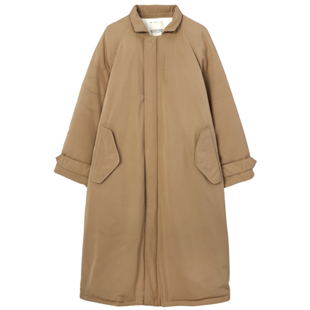 「辺見えみりさんがディレクターを務めるコンテの中綿コートは、小さめの襟でユニセックスかつモードな印象。中綿を薄く入れることで、程よいボリューム感に調整し、スタイリッシュなフォルムに仕上げています。キレイなAラインでオンオフ問わず使いやすいはず」