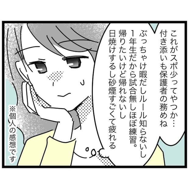 スポ少の練習中、グラウンドを離れてひとり時間を持てるようになったもっつんさん。けれども、そんな穏やかな時間は長くは続きませんでした。息子が練習中に問題行動を起こしていると知り、思い悩みます。