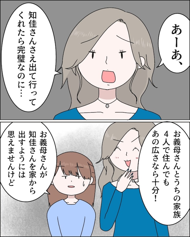 すると、「あーあ、知佳さんさへ出て行ってくれたら完璧なのに・・お義母さんとうちの家族4人で住んでもあの広さなら十分!」とすでにあのマンションに家族で住んでいることをイメージしているような麻里さん。「お義母さんが知佳さんを家から出すようには思えませんけど」私が呆れてそう言うと、