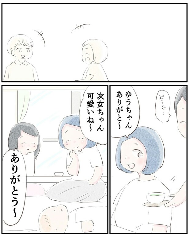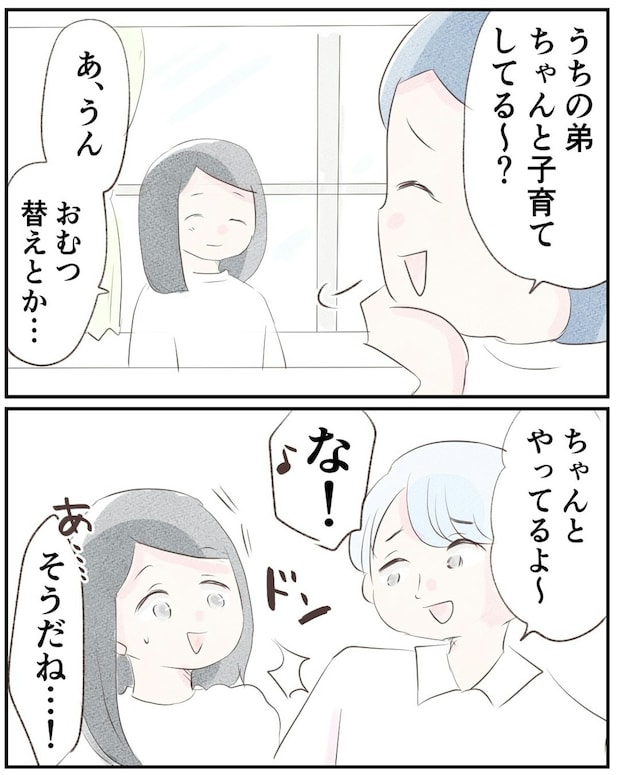 義姉が夫が子育てをしてくれているか聞いてきました。ゆうさんが話し始めると、夫が会話に割り込んできます。ゆうさんは戸惑いながら夫に返事をしました。