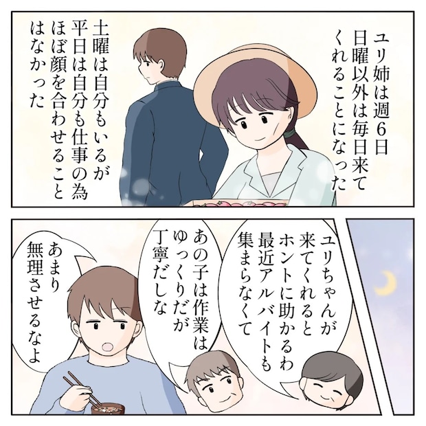 ユリ姉は、日曜以外は毎日来てくれることに。ただ、俺は平日は本業があるのでほとんど顔を合わせることはありませんでした。両親はユリ姉が来てくれて相当助かっているみたいで、「ユリちゃんが来てくれるとホントに助かるわ」「あの子は作業ゆっくりだが丁寧だしな」と彼女の仕事ぶりをこれでもかというほど褒めちぎっていました。