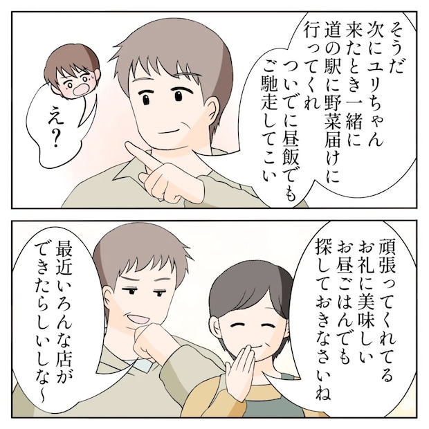 すると父は思いついたように「次にユリちゃんが来たとき一緒に道の駅に野菜届けに行ってくれ、ついでに昼飯でもご馳走してこい」と言いました。突然の提案に、俺は「え?」と驚きます。「頑張ってくれてるお礼に美味しいお昼ごはんでも探しておきなさいね」「最近いろんな店ができたらしいしな~」・・・この2人、絶対に楽しんでる。