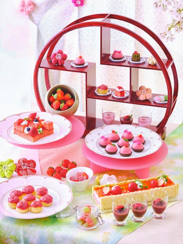 ビュッフェ台に並ぶのは、「いちご桜餡ショートケーキ」をはじめ、「いちご桜餡ティラミス」や「いちご桜餡抹茶カヌレ」など、いちごとさくらを組み合わせた春らしい味わいのスイーツたち。「いちごとほうじ茶のタルト」や「いちごわらびもち」なども用意されるので、旬のいちごのおいしさをさまざまな形で楽しんでみて。