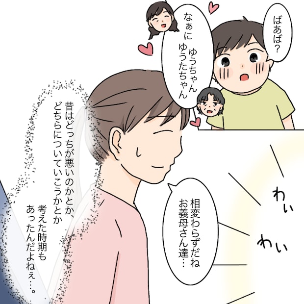 すると、大人たちの気まずい空気をよそにゆうたが「ばあば?」と甘えた声で呼びかけました。義母も義祖母も自分が呼ばれたと思い「なぁにゆうちゃん」「なぁにゆうたちゃん」とさっきまでの刺々しい声とはうってかわって優しい声で答えます。ゆうたのおかげで場が和みホッとしながら、私は「相変わらずだね、お義母さん達・・」と太郎と苦笑いしながら、「昔はどっちが悪いのかとか、どちらについていこうかとか考えた時期もあったんだよねぇ・・」と結婚当初のことを思い出しました。