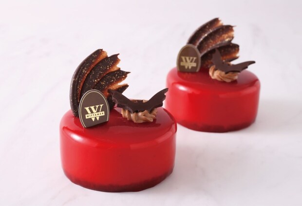 苺とフランボワーズの甘酸っぱいムースで、ホワイトチョコレートとライムのムースを包み、チョコアーモンドスポンジに重ねた。爽やかなライムの味わいが広がるまろやかなホワイトチョコレートのムースと、華やかなベリーが調和した味わい。コウモリの飾りと真っ赤なグラサージュでハロウィンの妖艶な雰囲気を演出する。