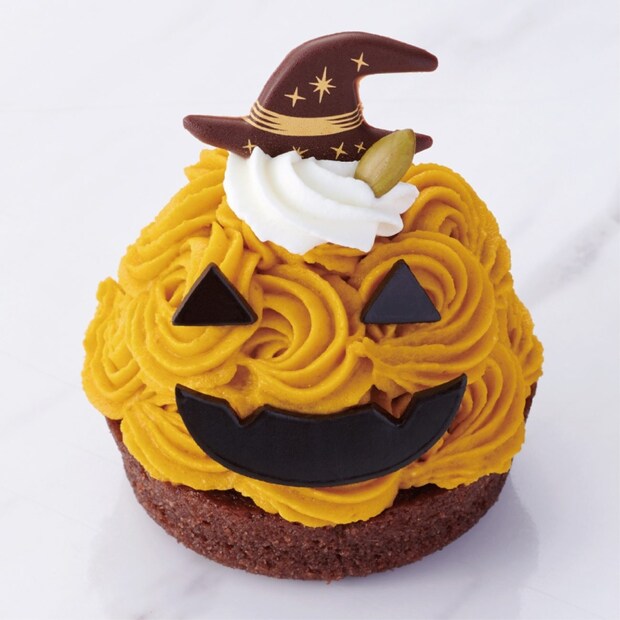 ジャック・オ・ランタンをイメージした顔と帽子で飾りつけした、ハロウィンらしいケーキ。コクのある北海道産えびすかぼちゃを使用した濃厚なパンプキンクリームに、ほろ苦いキャラメル風味のクリームブリュレを合わせた。