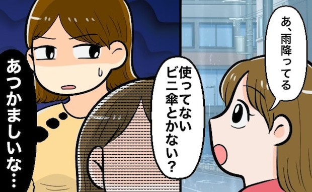 その子に、「使ってないビニ傘とかない?」って聞かれて、あつかましいなぁ...と心の中でムッとしてしまいました。