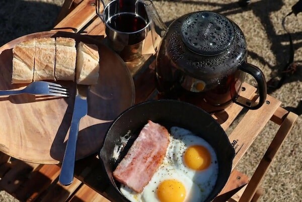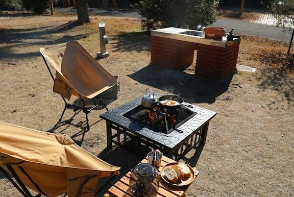 「焚き火カフェ」では、スキレットを使用した「焚き火ランチ」など焚き火調理ができ、宿泊者に限らず日帰りでの利用も可能だ。地域住民や観光客に向けて、自然の中で過ごす時間を提供する。