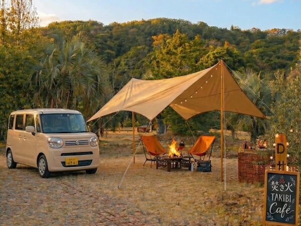 「焚き火カフェ」は、アウトドア用品を持たずとも、区画ごとのプライベート空間で焚き火を囲みながら飲食や滞在を楽しめる体験型サービス。各区画には車を横付けでき、初心者でも気軽にアウトドアを体験できる。
