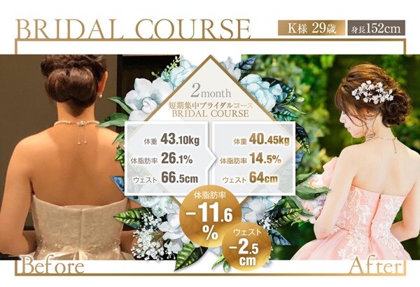 結婚式前のブライダルダイエットや産後ダイエットにも対応しており、目標・目的に向けて並走してサポートする。ブライダル割引10%オフも実施している。